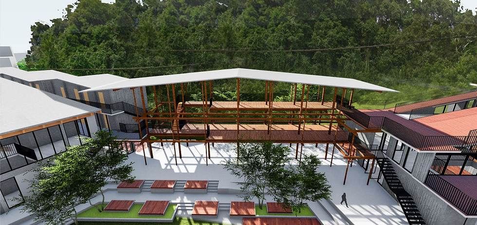 Gateway for Mersing Nature located at site 3, foothill of Mersing Forest Reserve, aims to connect the rainforest, reef, river, and town which are the gems of Mersing and bring people together with nature, to learn and to experience nature. Gateway of Mersing Nature target users is a community, nature lover and tourist, including transiting tourist and aims to act as a new node for the tourist and community providing nature-related workshops, bed, and breakfast, gallery, community library, guided tour by the community and an outdoor amphitheater for events. It accommodates the needs of tourists such as shower area, locker area, waiting area, shuttle services to nearby landmarks, car rental, bicycle rental and accommodation, and also community needs such as leisure area, event space, study area, and business area.
